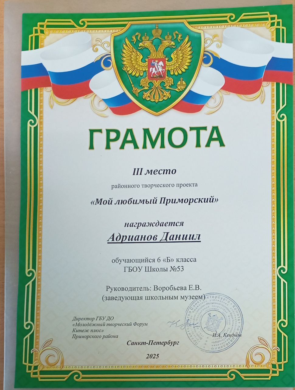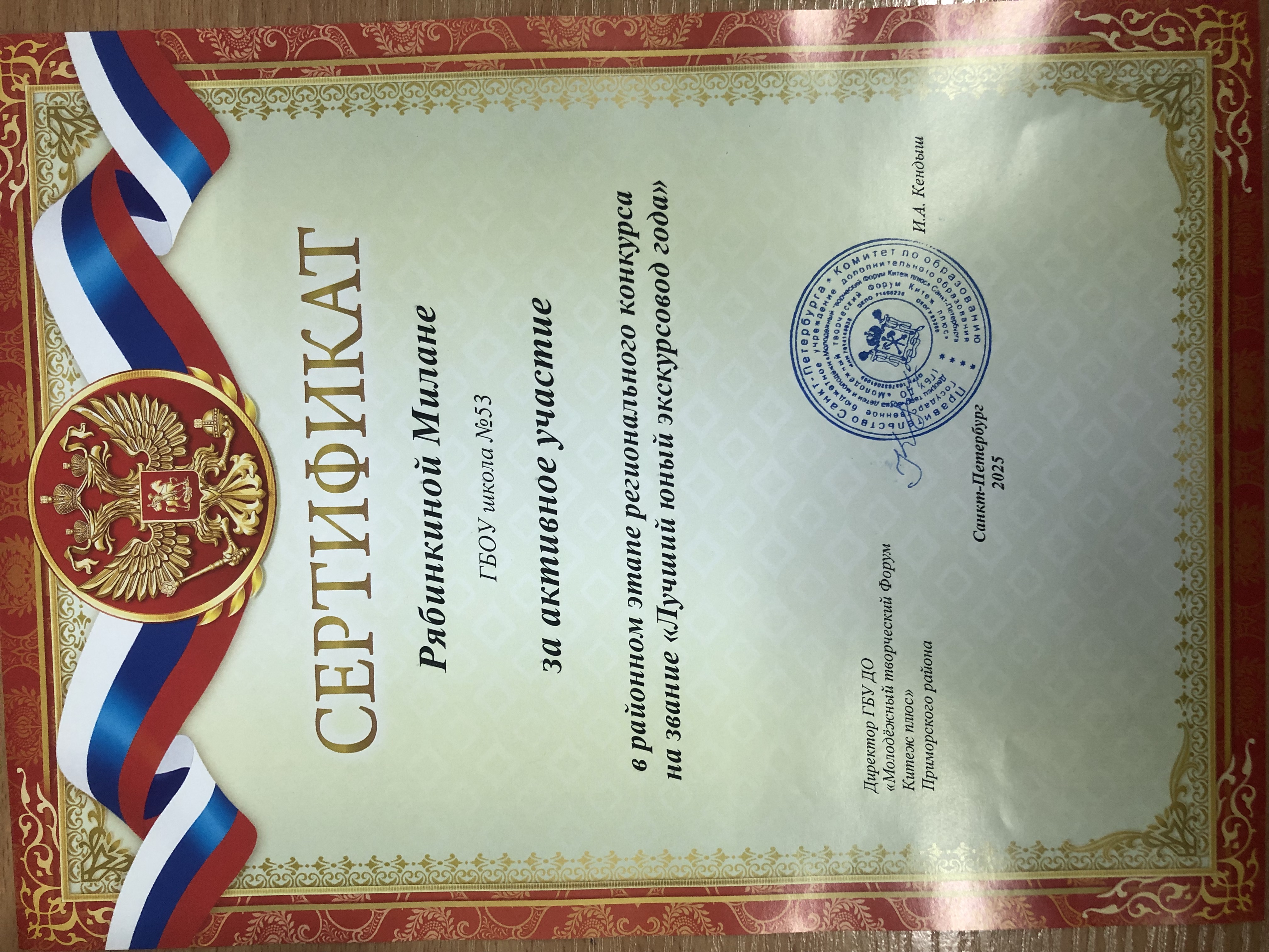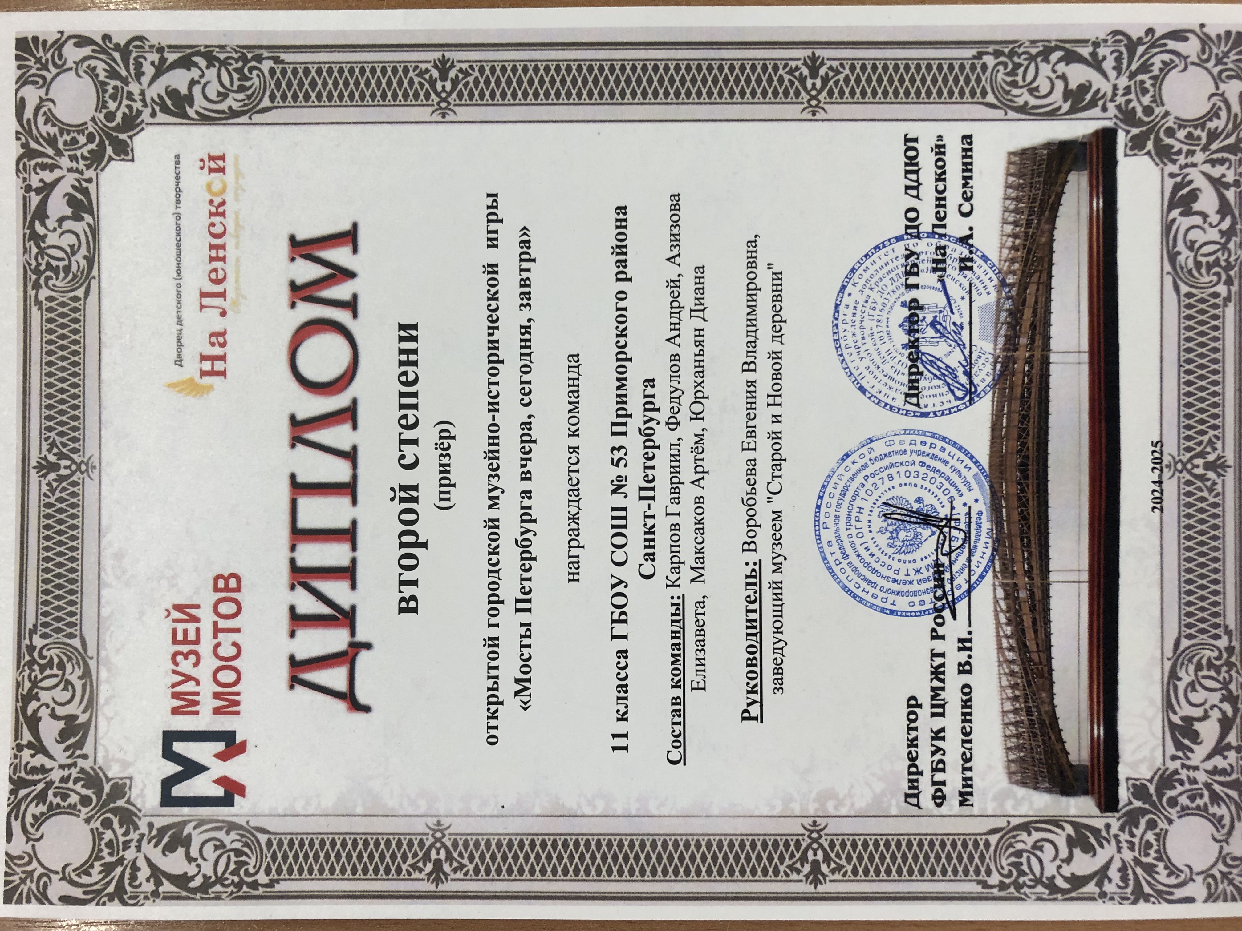 Вторым важным аспектом этой деятельности является участие ребят в различных районных и городских конкурсах. В 2024-2025 учебном году председатель школьного музейного клуба Гавриил Карпов (теперь уже выпускник нашей школы) показал прекрасные результаты в районных(Iместо) и городских (IIIместо) турах конкурсов «Лучший юный экскурсовод года», «Лучший юный экскурсовод школьных музеев», команда нашего клуба получила Диплом IIстепени в городской музейно-исторической игре «Мосты Санкт-Петербурга. Вчера. Сегодня. Завтра». На районной конференции «Адреса блокадного города» получил диплом IIIстепени Андрей Федулов, а Даяна Аристова-Осипова получила диплом за 2 место в литературно-краеведческом конкурсе «Давно стихами говорит Нева», сняв видео о Пушкинских местах Санкт-Петербурга. Даниил Адрианов получил Грамоту за IIIместо в районном творческом проекте «Мой любимый Приморский».