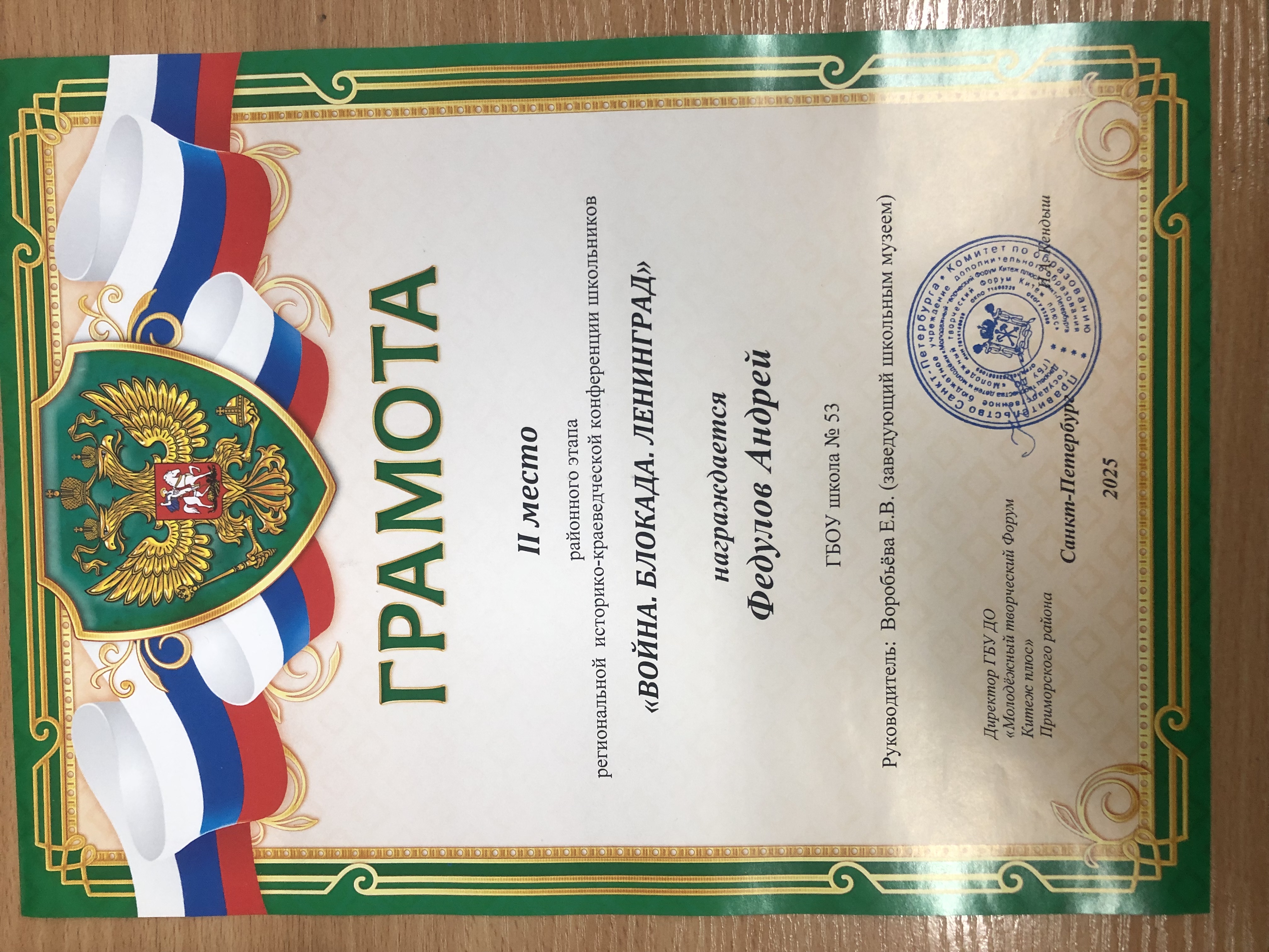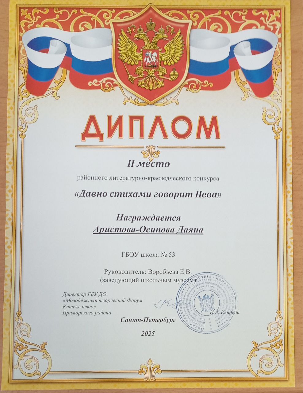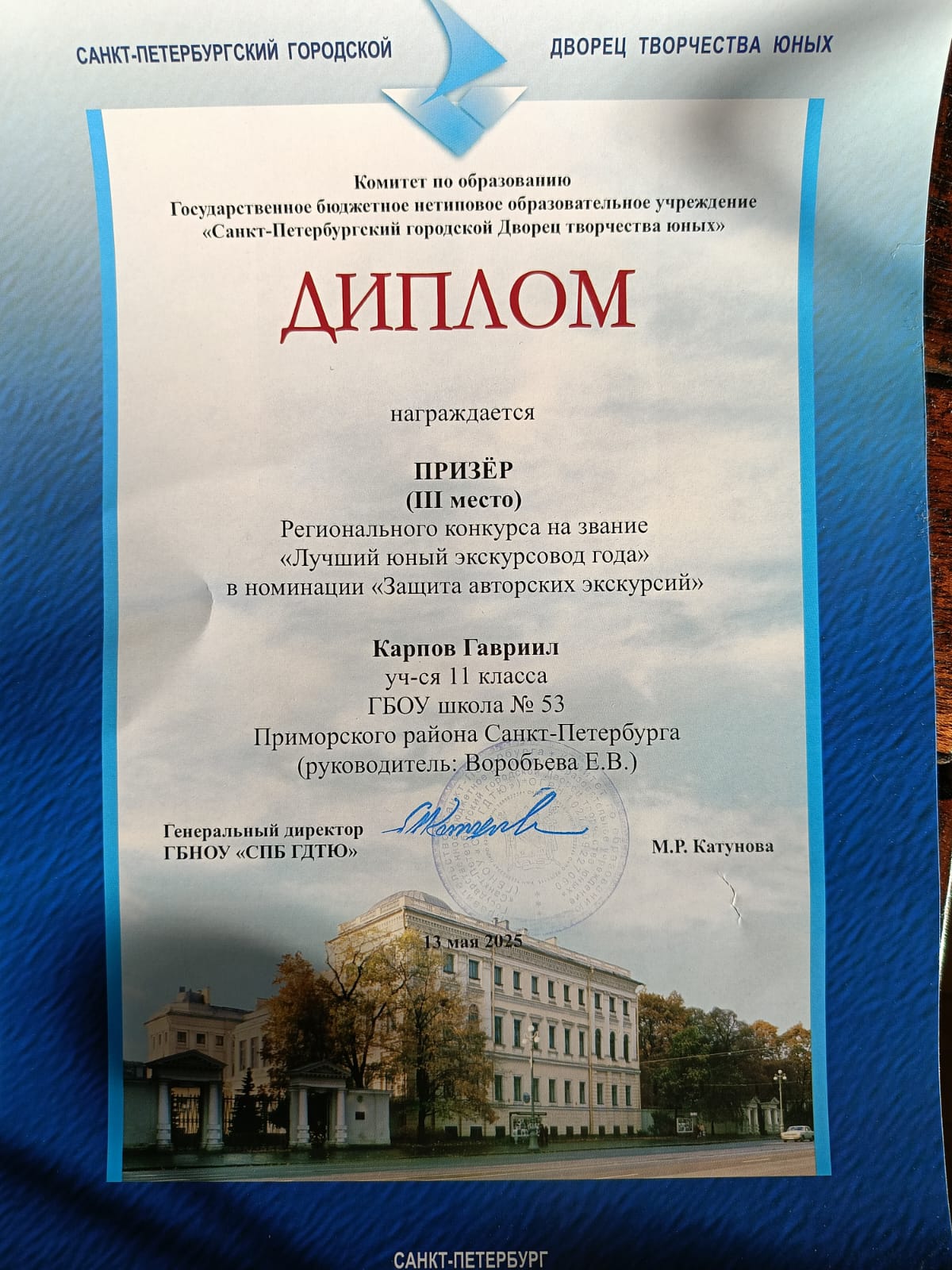 Вторым важным аспектом этой деятельности является участие ребят в различных районных и городских конкурсах. В 2024-2025 учебном году председатель школьного музейного клуба Гавриил Карпов (теперь уже выпускник нашей школы) показал прекрасные результаты в районных(Iместо) и городских (IIIместо) турах конкурсов «Лучший юный экскурсовод года», «Лучший юный экскурсовод школьных музеев», команда нашего клуба получила Диплом IIстепени в городской музейно-исторической игре «Мосты Санкт-Петербурга. Вчера. Сегодня. Завтра». На районной конференции «Адреса блокадного города» получил диплом IIIстепени Андрей Федулов, а Даяна Аристова-Осипова получила диплом за 2 место в литературно-краеведческом конкурсе «Давно стихами говорит Нева», сняв видео о Пушкинских местах Санкт-Петербурга. Даниил Адрианов получил Грамоту за IIIместо в районном творческом проекте «Мой любимый Приморский».